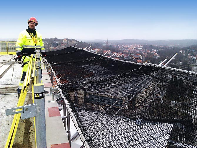 Skyddsskärm som är konstruerad för att monteras på bjälklag används för att fånga upp nedfallande material och föremål (ej person), som kan innebära risk för skador på personer eller objekt. Skyddsskärmssystemet är ett komplement till vårt ordinarie fallskyddssystem och med möjligheten att direkt integrera SafetyRespects ordinarie fallskyddsprodukter.